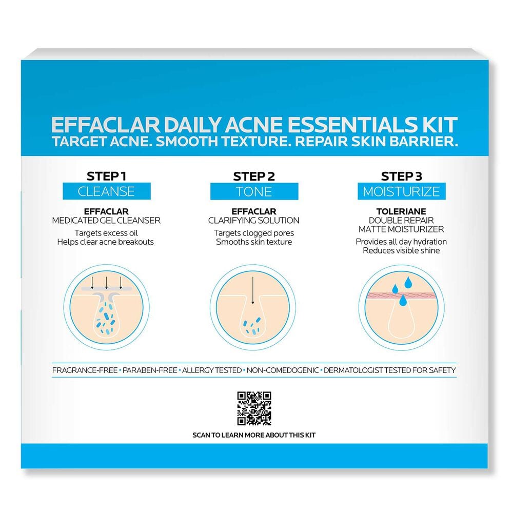 This 3-step skin care routine for oily and acne-prone skin features the Effaclar Medicated Gel Cleanser to target excess oil and help clear acne breakouts, Effaclar Clarifying Solution to target clogged pores and smooth skin texture, and Toleriane Double Repair Matte Moisturizer to provide all day hydration and reduce visible shine.