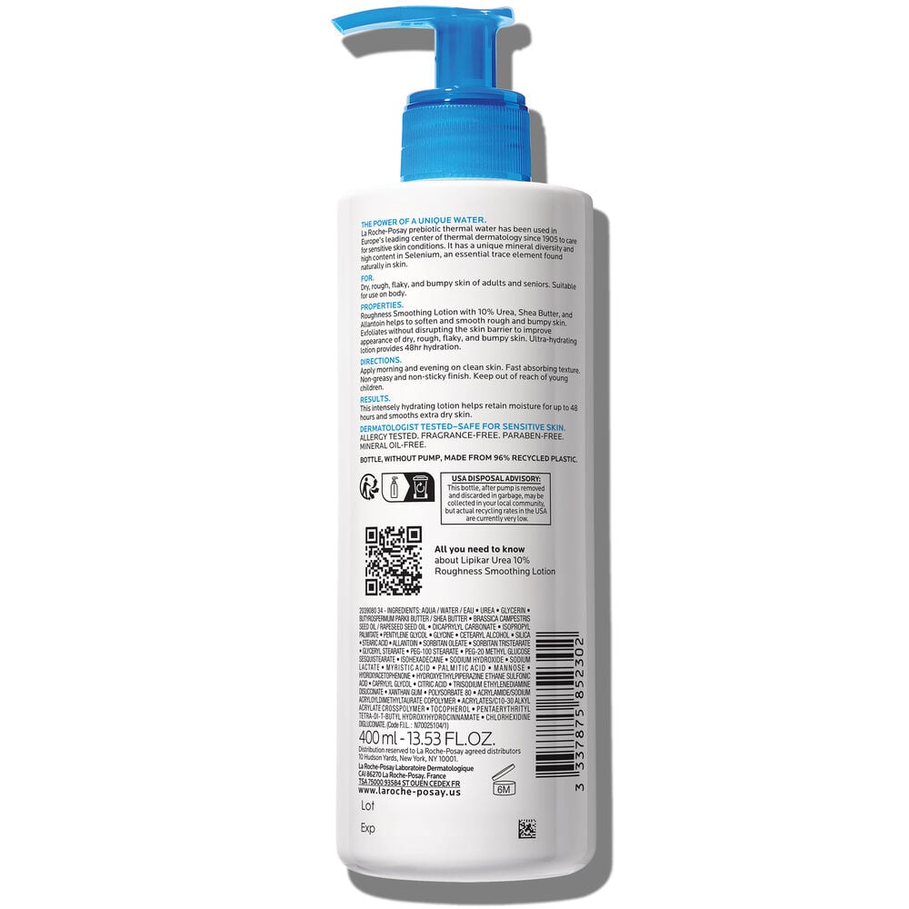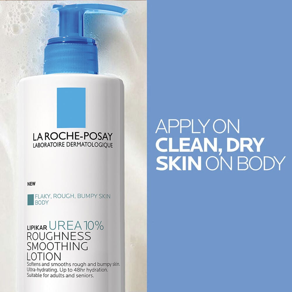 Lipikar Urea 10% Roughness Smoothing Lotion exfoliates skin without disrupting the skin barrier and softens and smooths dry, rough, and bumpy skin with only application. This ultra-hydrating body lotion provides up to 48 hour hydration and improves skin’s moisture barrier in hour in non-sticky, fast-absorbing texture.
