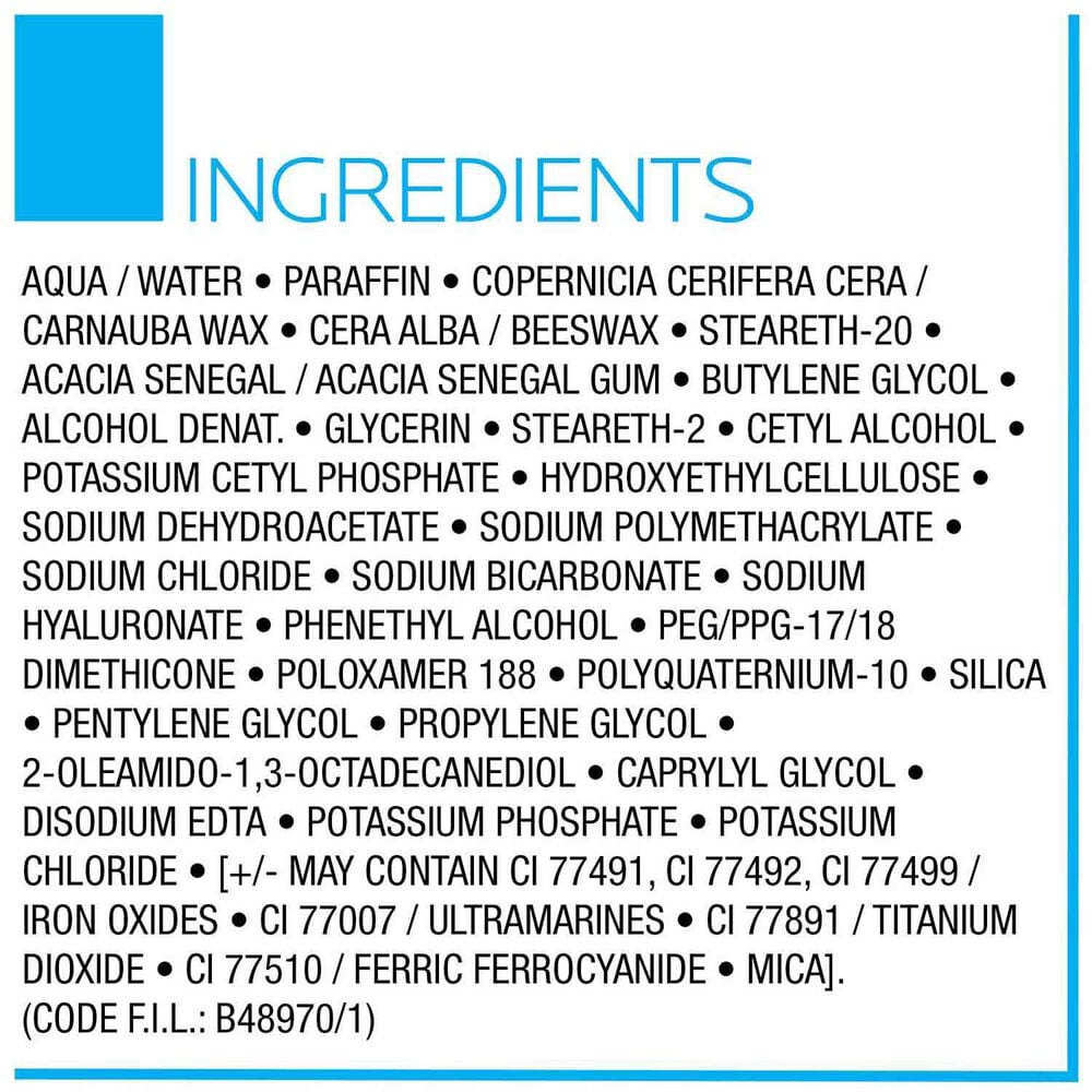 AQUA WATER PARAFFIN COPERNICIA CERIFERA CERA/CARNAUBA WAX CERA ALBA/BEESWAX STEARETH-20 ACACIA SENEGAL/ACACIA SENEGAL GUM BUTYLENE GLYCOL ALCOHOL DENAT GLYCERIN STEARETH-2 CETYL ALCOHOL POTASSIUM CETYL PHOSPHATE HYDROXYETHYLCELLULOSE SODIUM DEHYDROACETATE SODIUM POLYMETHACRYLATE SODIUM CHLORIDE SODIUM BICARBONATE SODIUM HYALURONATE PHENETHYL ALCOHO PEG/PPG-17/18 DIMETHICONE POLOXAMER 188 POLYQUATERNIUM-10 SILICA PENTYLENE GLYCOL PROPYLENE GLYCOL 2-OLEAMIDO-1 3-OCTADECANEDIOL CAPRYLYL GLYCOL DISODIUM EDTA POTASSIUM PHOSPHATE POTASSIUM CHLORIDE CI 77491 CI 77499 IRON OXIDES CI 77491 CI 77492 CI 77499 IRON OXIDES CI 77007 ULTRAMARINES CI 77891 TITANIUM DIOXIDE CI 77510 FERRIC FERROCYANIDE MICA